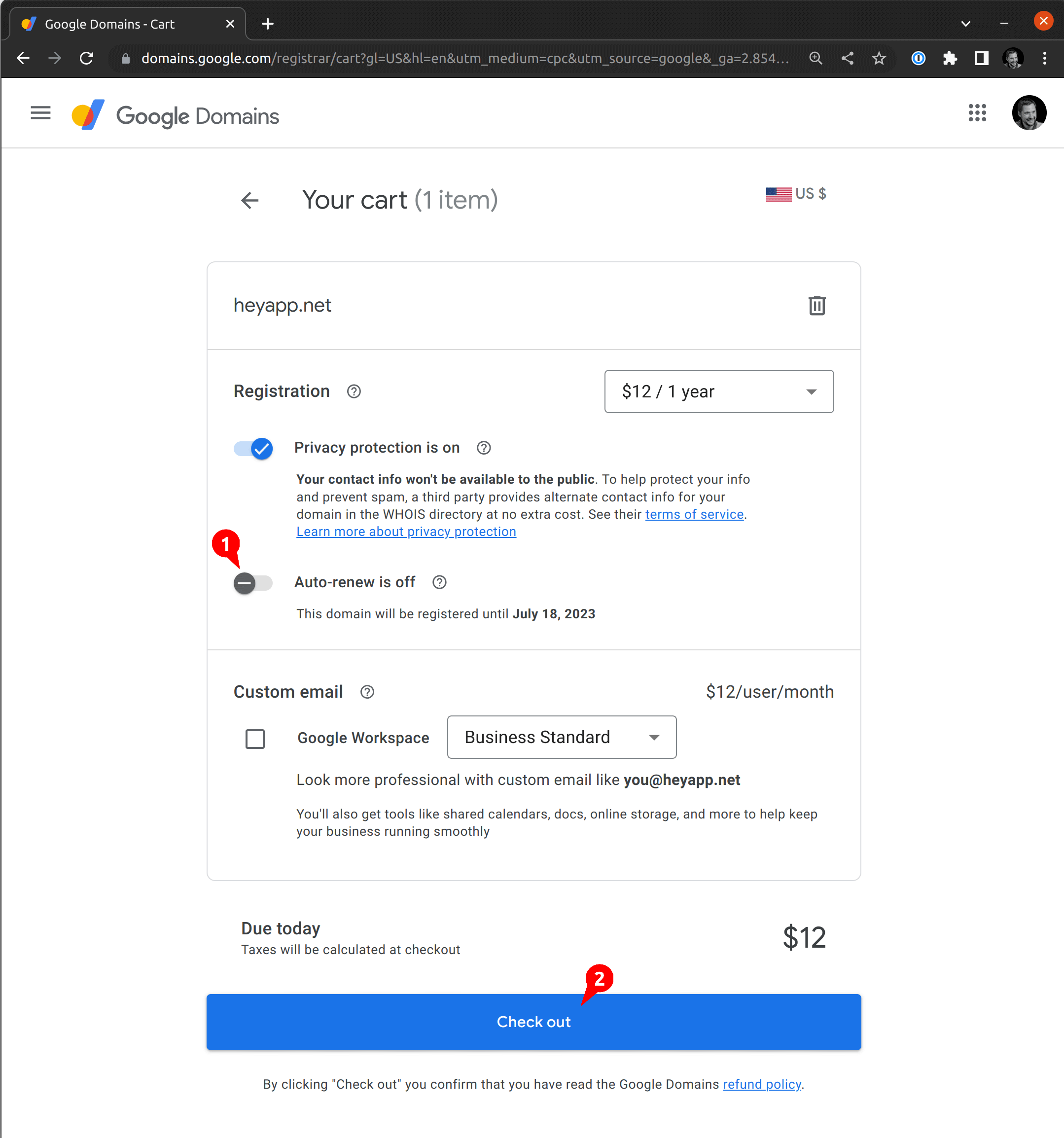 You will need a domain name and the ability to create DNS records in that domain. We will be getting a $12 domain name from Google Domains. Google Domains is one of the many possible "domain name registrars". NameCheap and GoDaddy are two other well-known registrars.